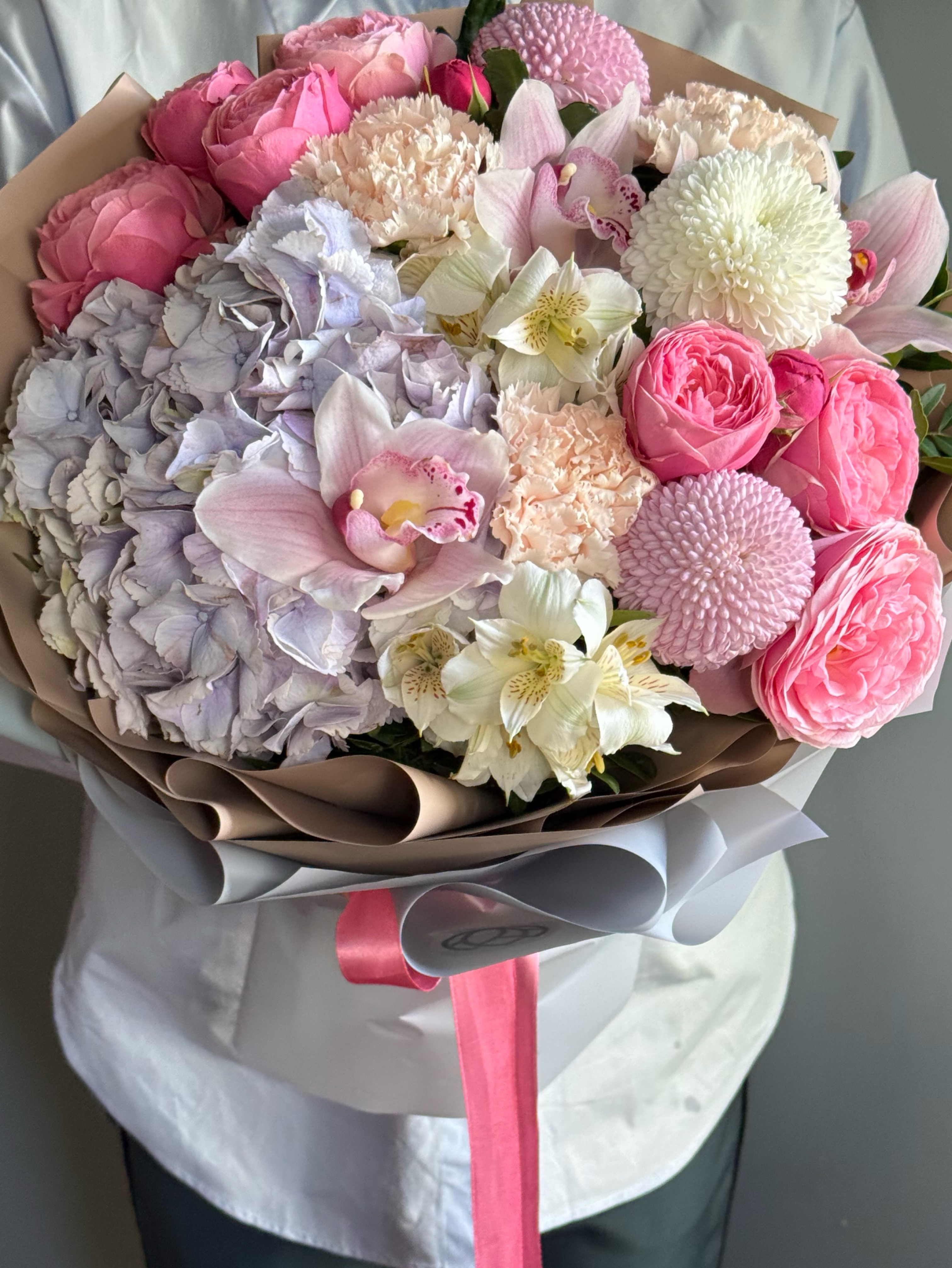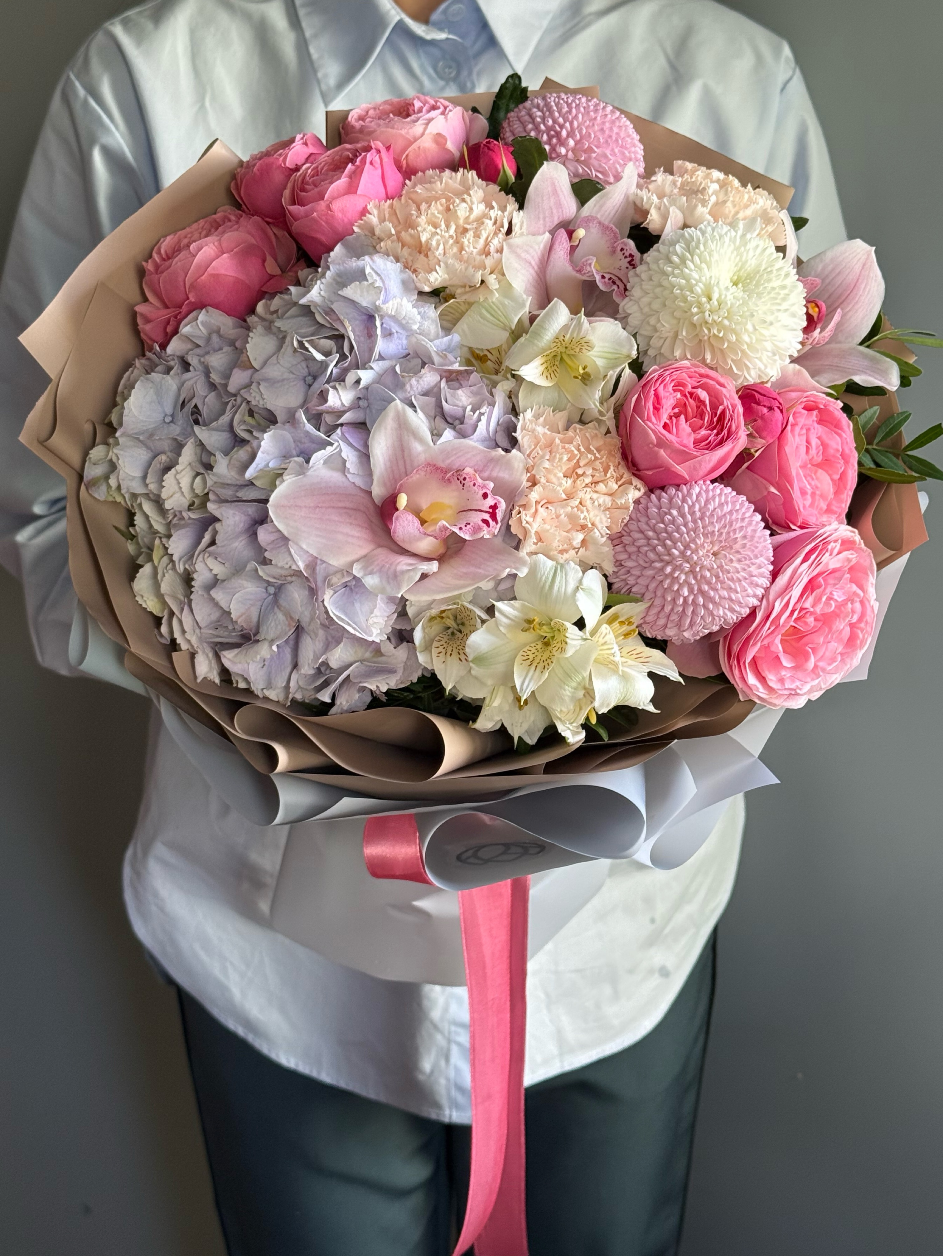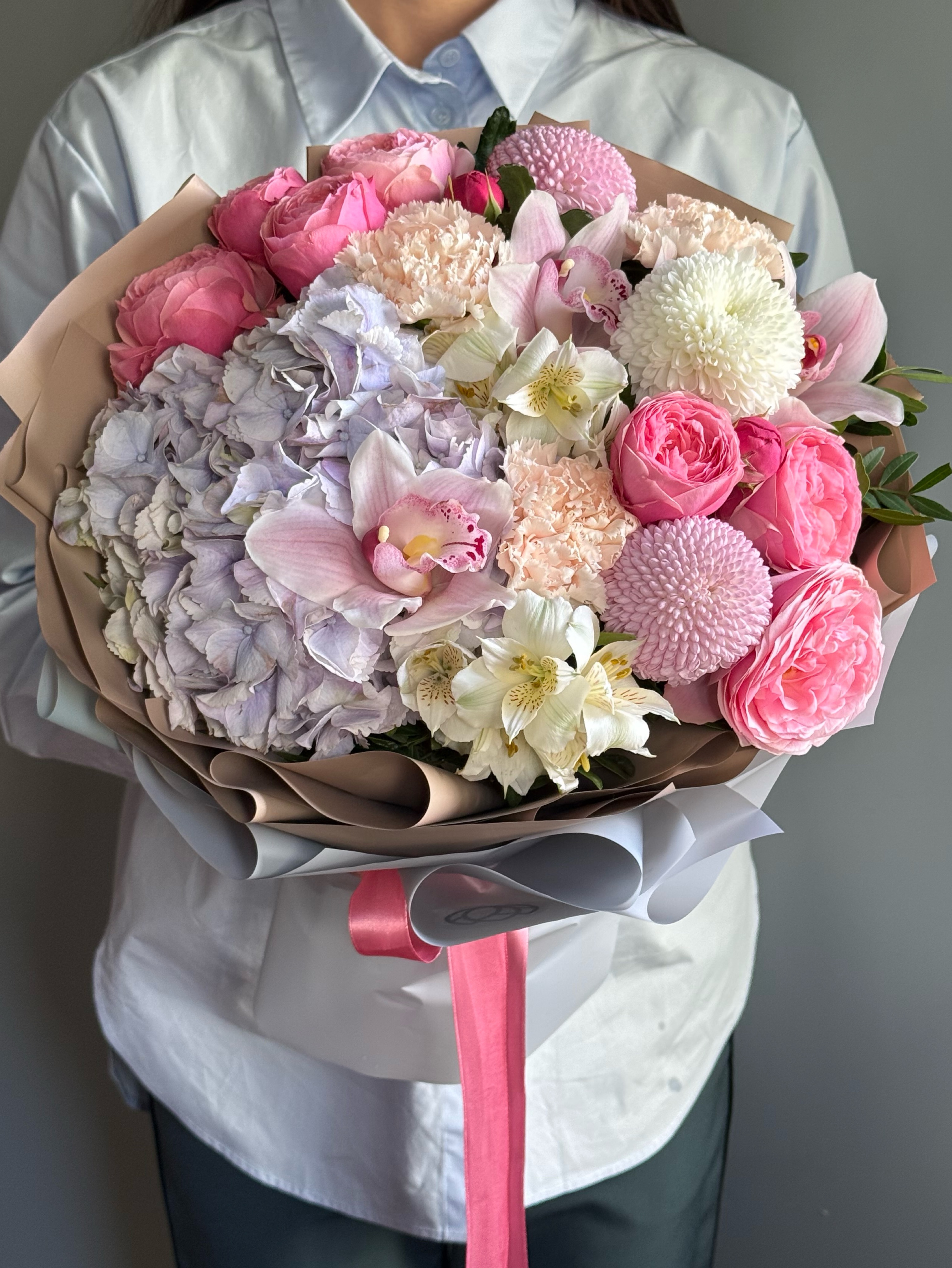 Букет словно россыпь ярких леденцов с разнообразным цветочным составом: воздушная гортензия, нежная альстромерия, орхидея, хризантемы момоко, премиальные пионовидные розы.