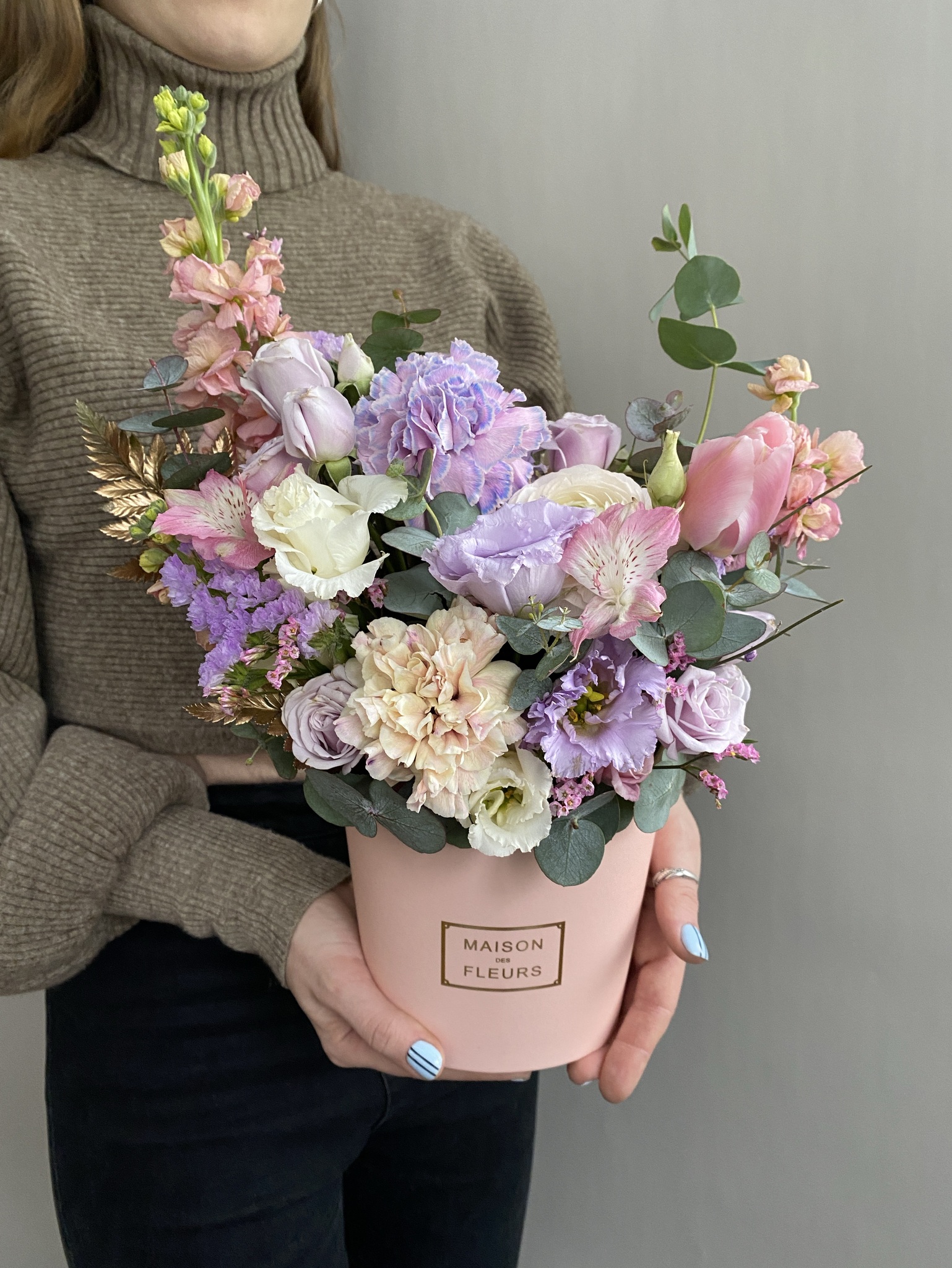 Нежная композиция с сиреневыми нотками. Кружевные лепестки диантусов, лизиантуса, маттиолы, кустовых розочек, альстромерии и ароматного эвкалипта создают неповторимый цветочный ансамбль.