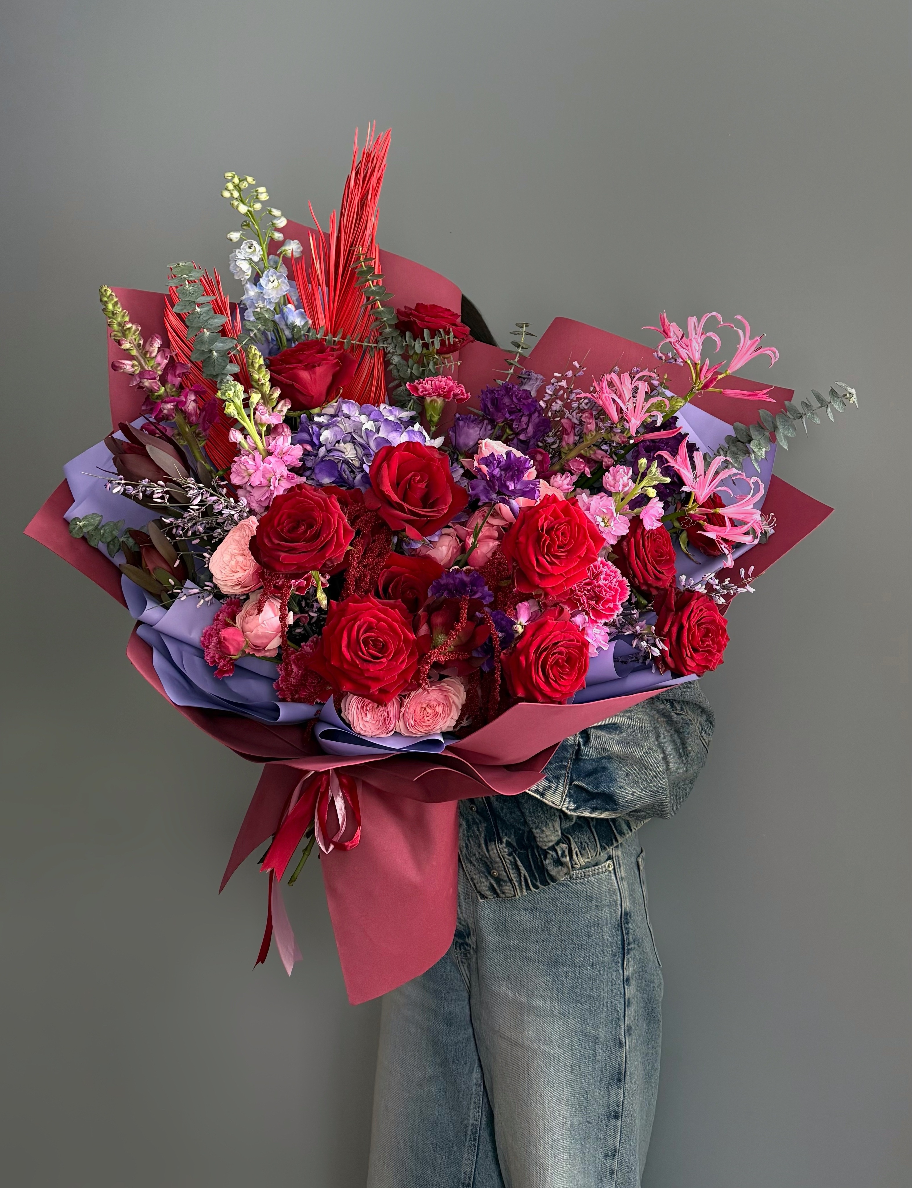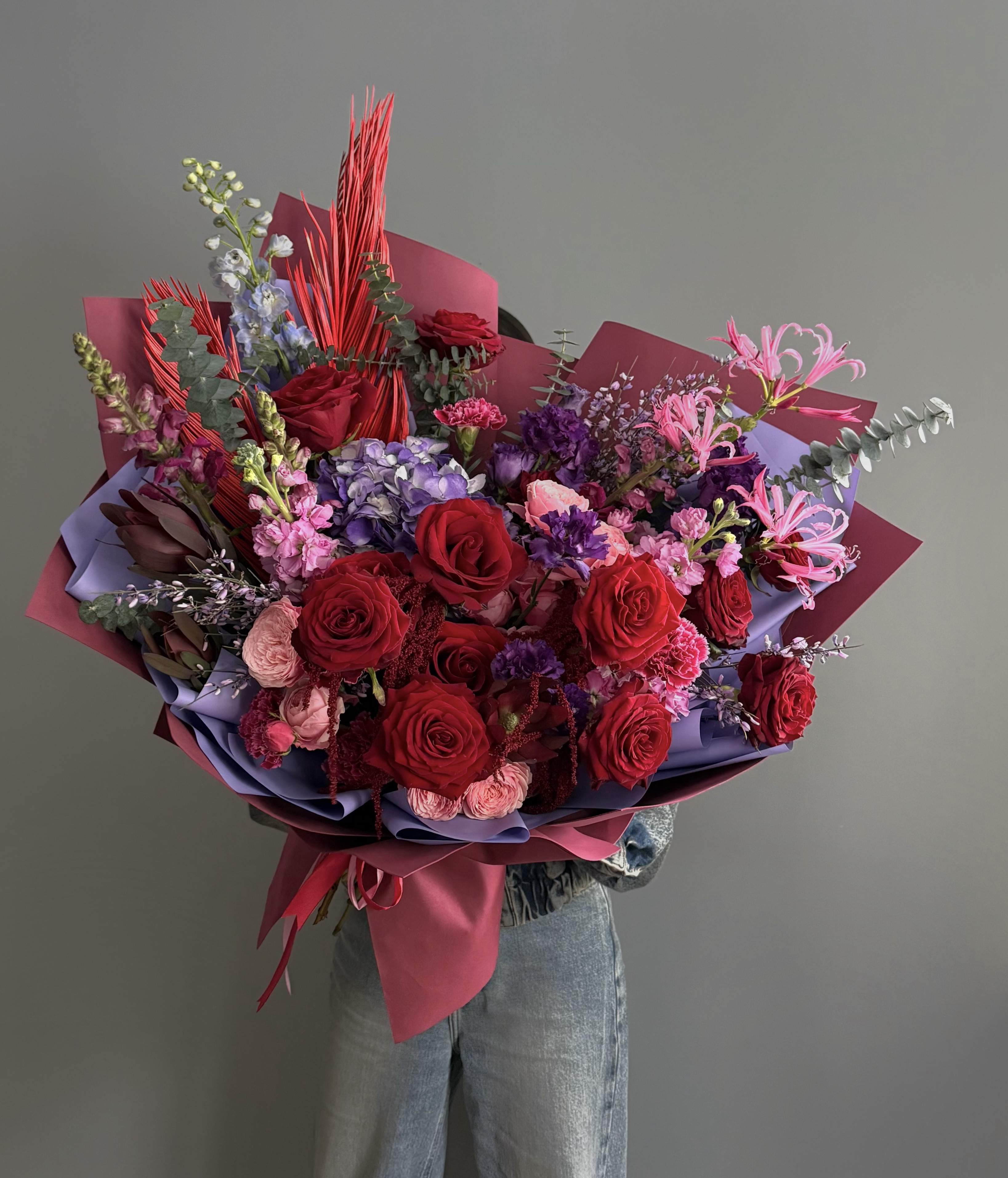 В составе букета воздушная гортензия, сортовые розы, премиальные пионовидные розы, лизиантус, дельфиниум, статный дельфиниум и антиринум, ароматная маттиола, космическая глориоза, леукодендрон, весенняя гениста, веточки эвкалипта, декоративный лист пальмы.